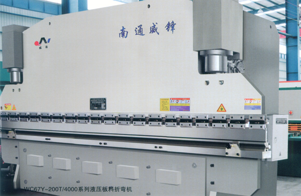 性能与特点: 1、整机钢板焊接结构,采用振动时效消除内应力,机器强度高、刚性好; 2、液压双油缸上传动,机械挡块,扭轴同步,运行平稳可靠,精度高; 3、后挡料距离及滑块行程采用电动调节及手动微调方式,并配有数字显示装置,使用方便快捷; 4、上模配有挠度补偿装置,250吨和长度4000mm 以上机床可采用下挠度补偿机构。