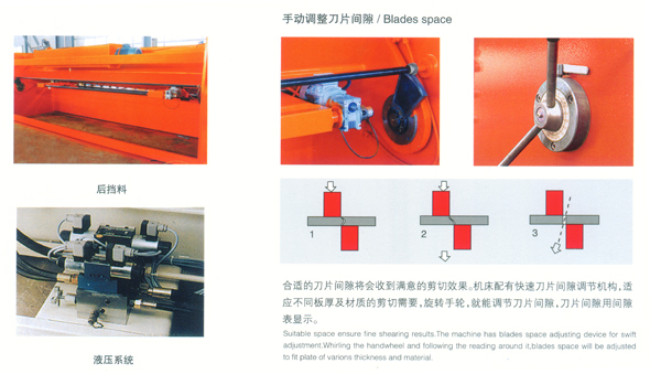 性能特点: 1、液压传动、摆式刀架。机架整体焊接坚固耐用,使用氮气缸回程,平稳迅速。 2、具有无级调节行程的功能,上下刀片口间隙量用手柄调节,刀片间隙均匀快速易调。 3、防护栅与电器连锁确保操作安全。 4、后档料尺寸及剪切次数有数字显示装置。 5、NS数控系统与位置编码器组成闭环控制系统,速度快、精度高、稳定性好,能精确地保证后挡料位移尺寸的精度,同时数控系统具有精度补偿功能及自动检测的多种附加功能。